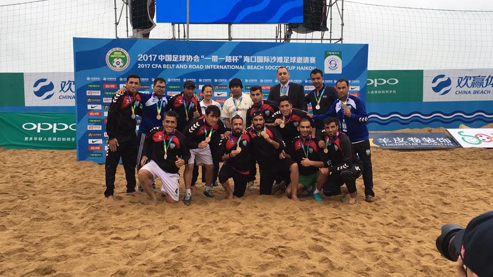 Afghanistan national beach soccer team could beat China, the host, 1-0 in its last game within the frame of 2017 CFA Belt and Road International Beach Soccer Cup, Rauf Qaderi scored the goal for Afghanistan, and the team placed second. The competitions are held annually among powerful Asian teams and hosted by China. Afghanistan national beach soccer team was invited to the competitions after they performed well in Asian tournaments. The country’s national beach soccer team finished second after a lose againt Oman and two wins against Malaysia and China. It is worth mentioning that Afghanistan is currently 54th in the world and 10th in the Asia ranking, and gaining points from this competition will have a positive impact on the national team’s ranking.